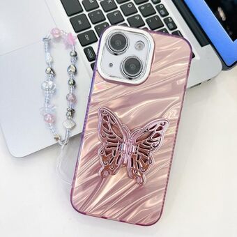 For iPhone 13 Plating Glitter Lens Film Texture Butterfly Holder Wristband Phone Case(Pink Water Ripples)