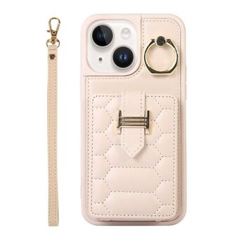 For iPhone 13 Horizontal Card Bag Ring Holder Phone Case with Dual Lanyard(Beige)