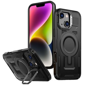 For iPhone 14 Shield Hollow Frame Holder MagSafe Phone Case(Black)