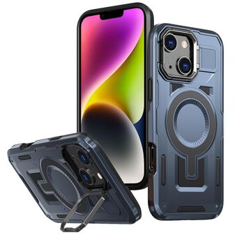 For iPhone 14 Shield Hollow Frame Holder MagSafe Phone Case(Navy Blue)