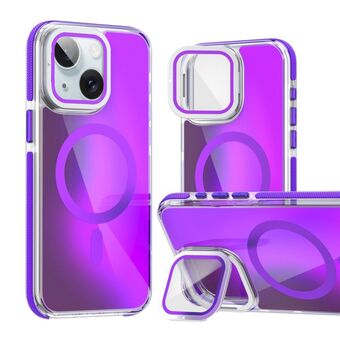 For iPhone 14 Plus MagSafe Gradient Color Lens Film Phone Case with Lens Fold Holder(Purple)