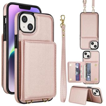 For iPhone 14 Plus Three Fold Card Bag Phone Case with Long Lanyard(Black)