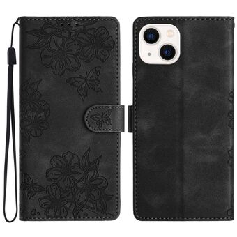 For iPhone 14 Plus Cherry Blossom Butterfly Skin Feel Embossed PU Phone Case(Black)