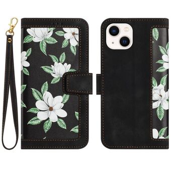 Θήκη τηλεφώνου από δέρμα με λουλουδάτο σχέδιο για iPhone 14 Plus με κορδόνι (Μαύρο)