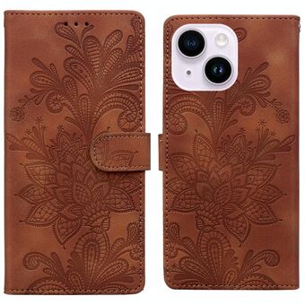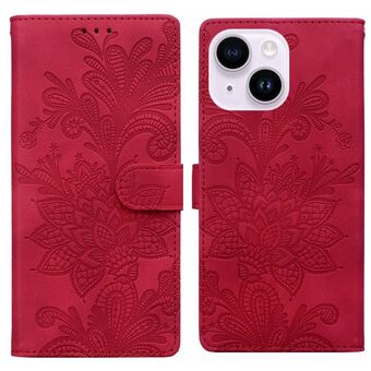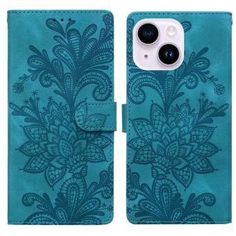 Θήκη τηλεφώνου από PU με μαγνητικό κούμπωμα και δαντέλα με λουλούδια σε ανάγλυφο για iPhone 14 Plus / 15 Plus με λουρί καρπού (Πράσινο)