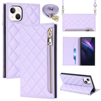 Θήκη τηλεφώνου δερμάτινη με φερμουάρ και λουρί με υφή πλέγματος για iPhone 14 Plus (Χρυσορόδινο)