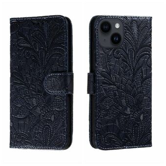 Θήκη τηλεφώνου από δέρμα με ανάγλυφο σχέδιο δαντέλας και λουλουδιών για iPhone 14 Plus (Μωβ)