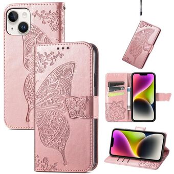 Θήκη δέρματος με ανάγλυφο σχέδιο πεταλούδας για iPhone 14 Plus (Ροζ)