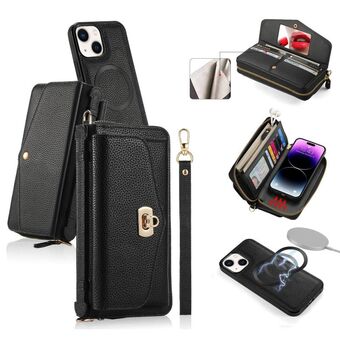 Θήκη τηλεφώνου για iPhone 14 Plus MagSafe Crossbody, πολυλειτουργική με φερμουάρ και δέρμα Lychee (Πορτοκαλί)