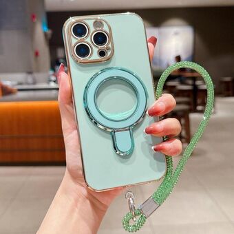For iPhone 14 Pro Max Solid Color Electroplated Metal Holder Phone Case with Lanyard(Light Green)