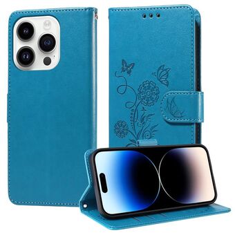 For iPhone 14 Pro Max Embossed Butterfly Flowers Leather Phone Case(Blue)