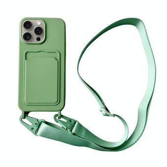 For iPhone 14 Pro Max Card Slot Liquid Silicone Phone Case with Lanyard(Matcha Green)