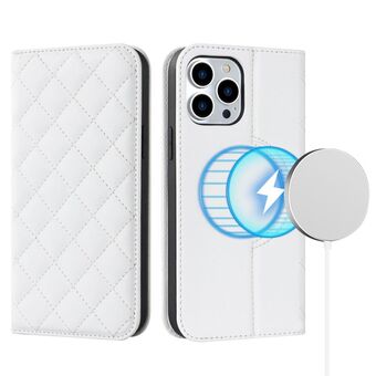 For iPhone 14 Pro Max Rhombic MagSafe RFID Anti-Theft Wallet Leather Phone Case(White)