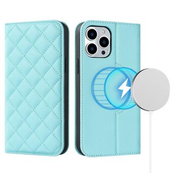 For iPhone 14 Pro Max Rhombic MagSafe RFID Anti-Theft Wallet Leather Phone Case(Sky Blue)