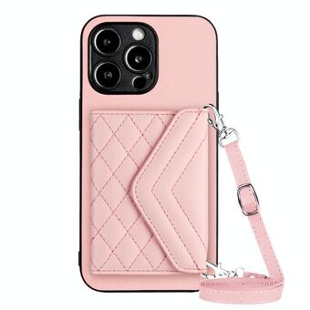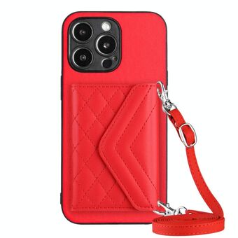 Θήκη τηλεφώνου από δέρμα με ανάγλυφη υφή ρόμβου για iPhone 14 Pro Max με μακρύ κορδόνι (Κόκκινο Ρόδι)