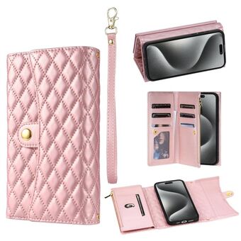 Θήκη κινητού τηλεφώνου από δέρμα με ρομβικό σχέδιο και πολλαπλές θήκες καρτών με φερμουάρ για iPhone 14 Pro Max (Μωβ)