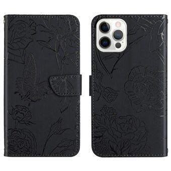 Θήκη τηλεφώνου από ανάγλυφο δέρμα για iPhone 14 Pro Max, αίσθηση δέρματος, με σχέδιο πεταλούδας και παιώνιας (Κόκκινο)