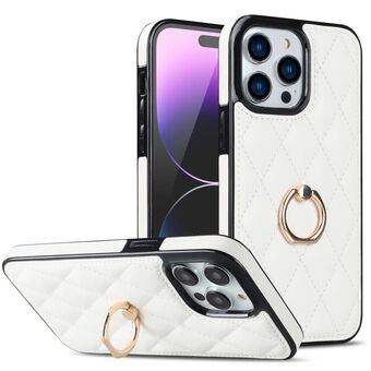For iPhone 14 Pro Rhombic PU Leather Phone Case with Ring Holder(White)