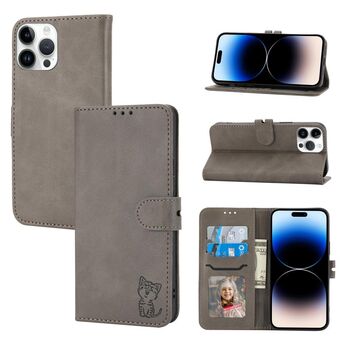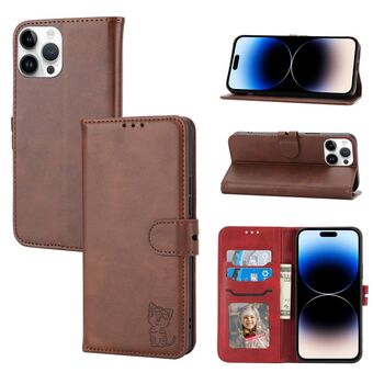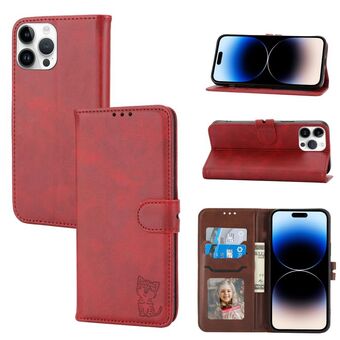 Θήκη τηλεφώνου από δέρμα με σχέδιο χαρούμενης γάτας σε ανάγλυφο για iPhone 14 Pro (Κόκκινο)