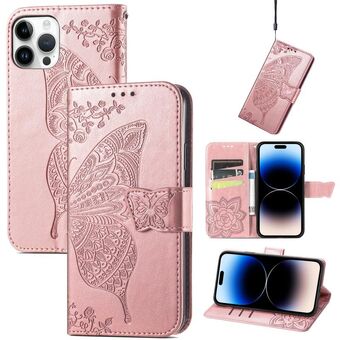 Θήκη δέρματος με ανάγλυφο σχέδιο πεταλούδας για iPhone 14 Pro (Ροζ)