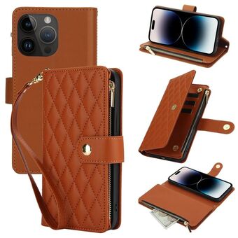 For iPhone 14 Pro YM016 Rhombic Zipper Card Wallet Leather Phone Case with Lanyard(Brown)