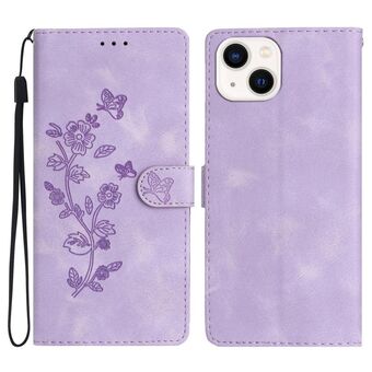 For iPhone 14 Flower Butterfly Embossing Pattern Leather Phone Case(Purple)