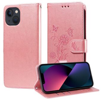 For iPhone 14 / 13 Embossed Butterfly Flowers Leather Phone Case(Rose Gold)