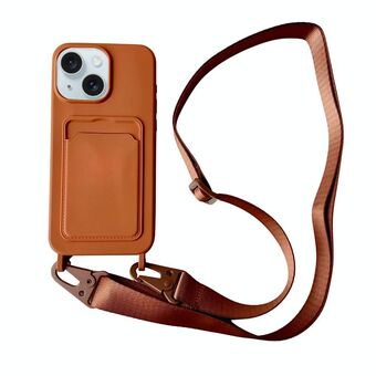 For iPhone 14 Card Slot Liquid Silicone Phone Case with Lanyard(Brown)