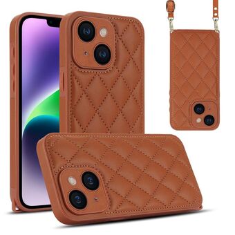 For iPhone 14 Rhombic Texture Phone Case with Dual Lanyard(Brown)