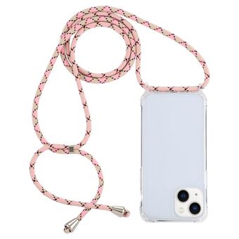 For iPhone 14 Four-Corner Shockproof Transparent TPU Case with Lanyard (Light Pink)