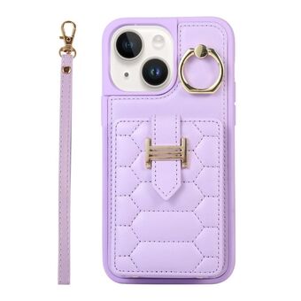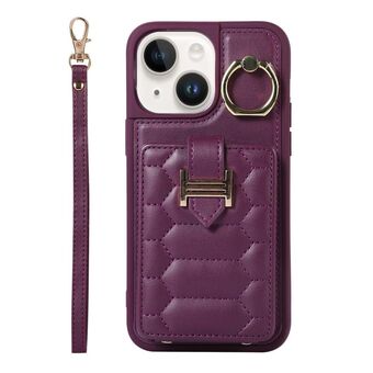For iPhone 14 Horizontal Card Bag Ring Holder Phone Case with Dual Lanyard(Purple)