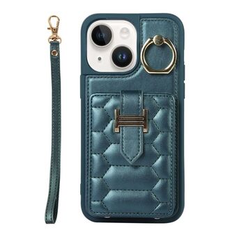 For iPhone 14 Horizontal Card Bag Ring Holder Phone Case with Dual Lanyard(Dark Green)
