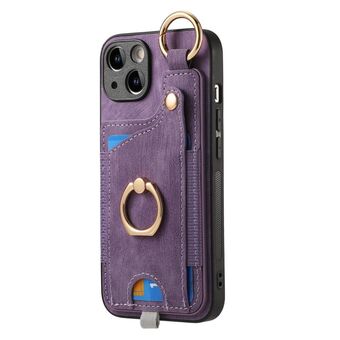 For iPhone 14 Retro Skin-feel Ring Card Bag Phone Case with Hang Loop(Purple)