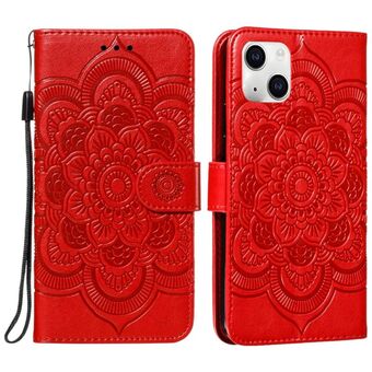For iPhone 15 Mandala Embossed Dual-Fold Calf Leather Phone Case(Red)
