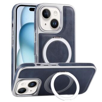 For iPhone 15 Plated Leather Grain Rotation MagSafe Holder Phone Case(Blue)