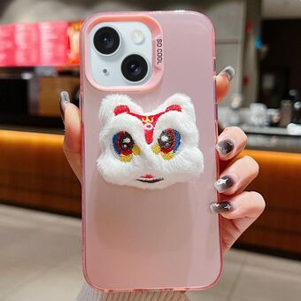 For iPhone 15 New Year Lion Dance Plush Doll Phone Case(Pink Back White Lion)