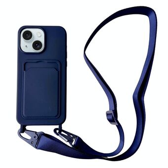 For iPhone 15 Card Slot Liquid Silicone Phone Case with Lanyard(Dark Blue)