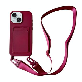 For iPhone 15 Card Slot Liquid Silicone Phone Case with Lanyard(Wine Red)