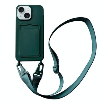 For iPhone 15 Card Slot Liquid Silicone Phone Case with Lanyard(Dark Green)