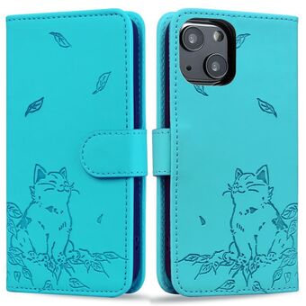 For iPhone 15 Cute Cat Embossed Leather Phone Case(Lake Blue)