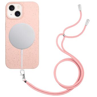For iPhone 15 Wheat MagSafe Magnetic Straw Material + TPU Phone Case with Lanyard(Pink)