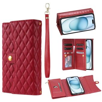 Θήκη τηλεφώνου δερμάτινη πολλαπλών λειτουργιών με φερμουάρ και λουρί για iPhone 15 (Κόκκινο)