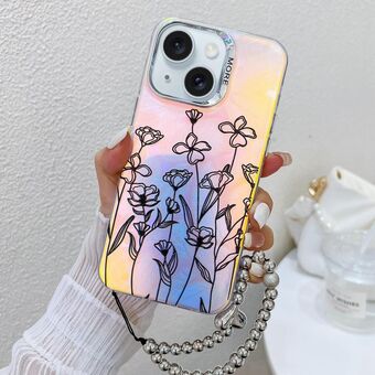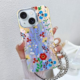 Θήκη τηλεφώνου με ηλεκτρολυτική επίστρωση και λουλούδια λέιζερ για iPhone 15 με λουρί καρπού (Σχέδιο Λουλουδιών AH3)