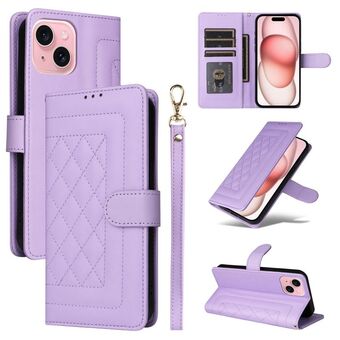 Θήκη κινητού τηλεφώνου για iPhone 15 από PU δέρμα με κάρτα οργάνωσης, δακτύλιο στήριξης και κορδόνι (Μωβ)