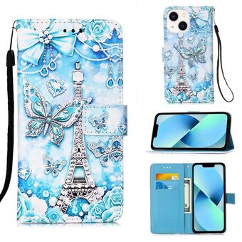 For iPhone 15 Colored Drawing Pattern Plain Weave Leather Phone Case(Tower Butterfly)