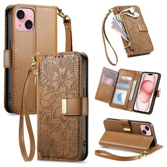 For iPhone 15 Plus Flowers Leaves Zipper Wallet Leather Phone Case with Strap(Brown)
