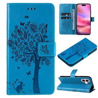 For iPhone 16 Tree & Cat Embossed Pattern Flip Leather Phone Case(Blue)