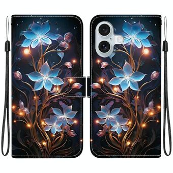 Θήκη τηλεφώνου από δέρμα με λουλουδάτο σχέδιο για iPhone 16 με κορδόνι (Ανοιχτό Μπλε)