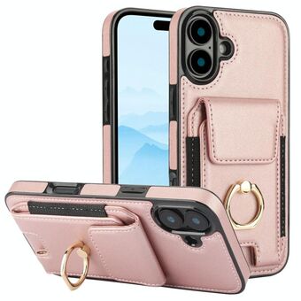 Θήκη τηλεφώνου για iPhone 16 με ρετρό υφή, δακτύλιο και πολλαπλές θήκες καρτών (Ροζ)