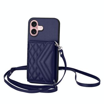 For iPhone 16 Rhombic Texture Card Bag RFID Phone Case with Long Lanyard(Blue)